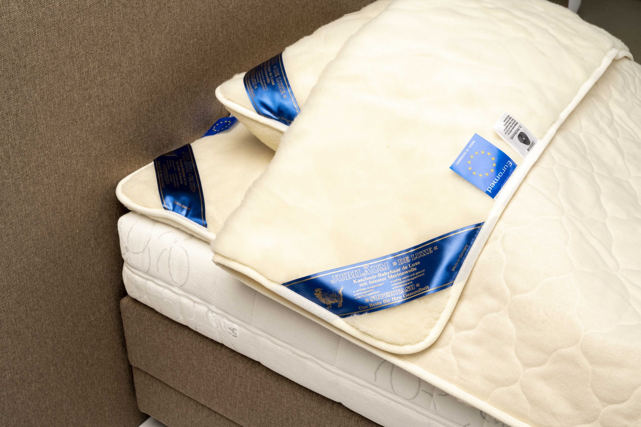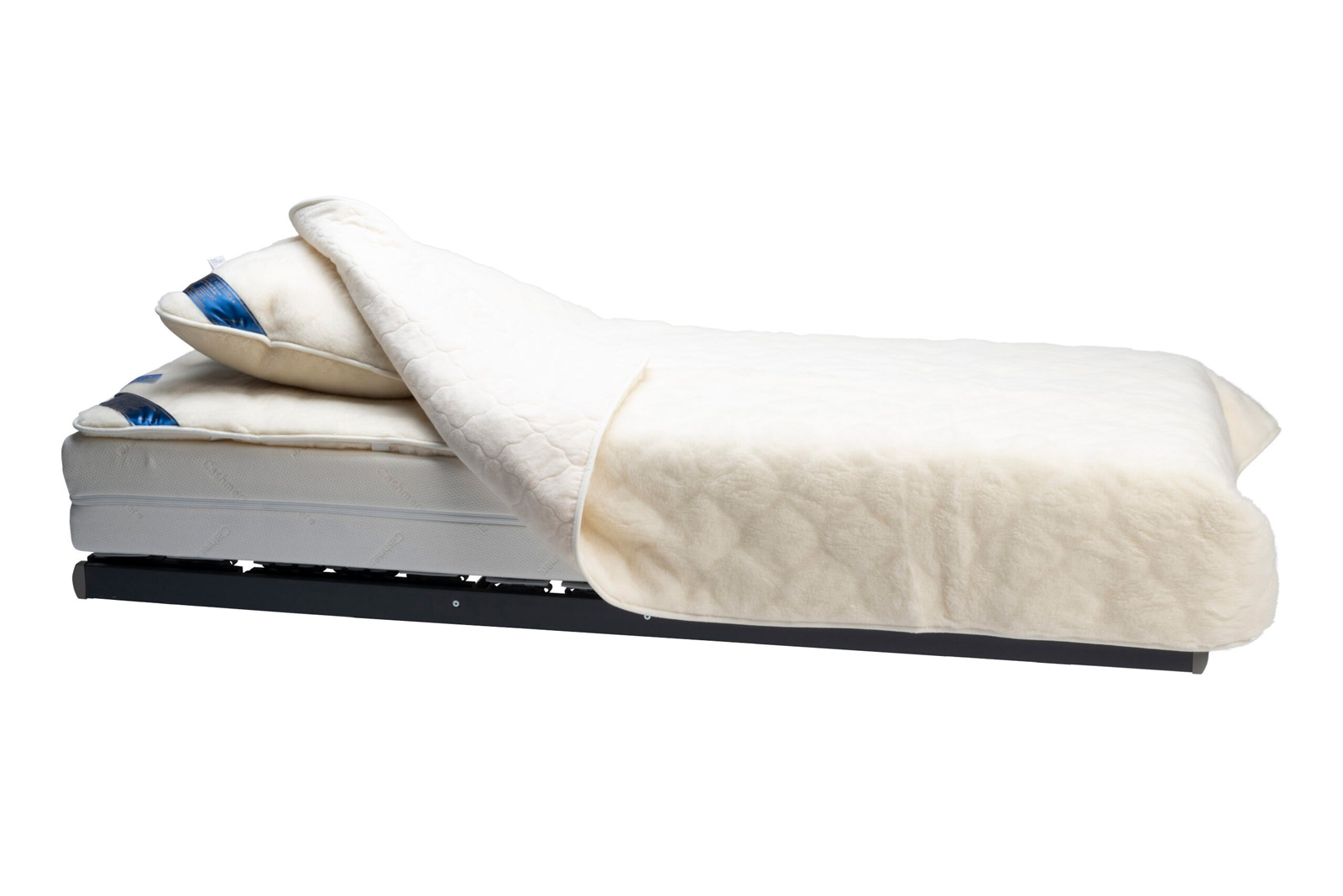 De onderdeken bestaat uit 3 lagen merino lamswol met kasjmier en ligt vast met elastieken op de matras. Zodra u in bed stapt, verwarmt uw lichaamstemperatuur de wol en is uw bed in een mum van tijd aangenaam warm. Die behaaglijke warmte blijft de hele nacht waardoor uw lichaam zich meer zal ontspannen. De onderdeken zorgt voor een optimale ventilatie in bed en kan nooit te warm worden want schapenvachten werden vroeger in het ziekenhuis tegen doorliggen gebruikt. (Doorliggen ontstaat door druk en transpiratie) Mag ’s zomers blijven liggen tegen de warmte en werkt het best in combinatie met een bovendeken. ’s Winters heeft u altijd een aangenaam bed. De onderdeken kan het best gebruikt worden met een onderlaken van katoen of flanel.